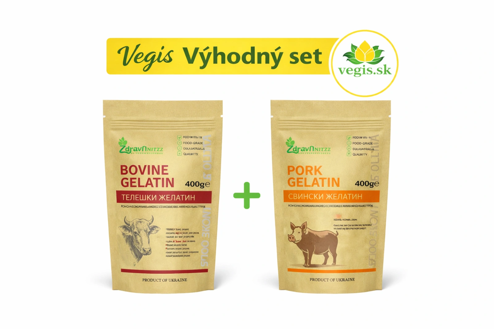 Vegis Výhodný set Želatína spája dva obľúbené produkty – hovädziu želatínu a bravčovú želatínu – do jedného praktického balíčka za zvýhodnenú cenu.
